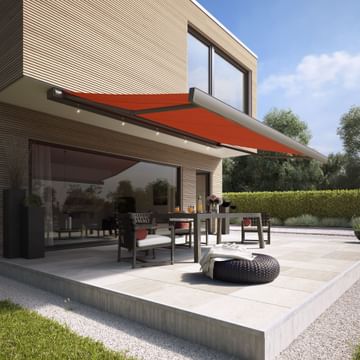 The 970 has a square design to it and looks great either face fixed to a home, or hung underneath a balcony as the brackets are almost invisible when the blind is fitted. Standard technology includes the Markilux bionic tendon arms - which are tested to over 50,000 operations.