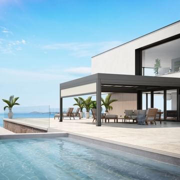 The Markant from Markilux is new concept in outdoor rooms. The very strong structure is modular in design, and can cover areas up to 6m x 6m in a single unit. The patented roof shade is electrically operated, and hides away when not is use. Uniquely, the roof is flat when across and the special combinations of hidden drainage let yours this even in light to moderate rain.