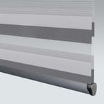 The Lustre White Mirage Blind is a calm and serene colourway with a unique two-tone design. The opaque stripe is split into white and grey while the semi-transparent section contains a geometric white thread design. The result is a thoroughly contemporary choice with a minimalist colour palette and sleek lines of block colour.